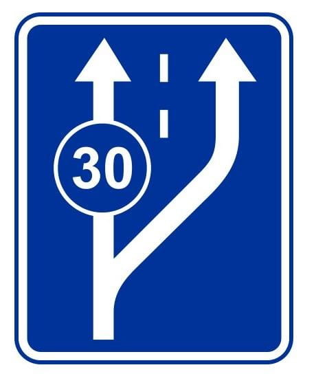Znak D-13 Początek pasa ruchu powolnego Oznacza początek pasa ruchu, z którego są obowiązani korzystać kierujący pojazdami nieosiągającymi na wzniesieniu minimalnej prędkości określonej na znaku liczbą kilometrów na godzinę. Umieszczona pod znakiem tabliczka T-1a wskazuje odległość do początku pasa ruchu. |
