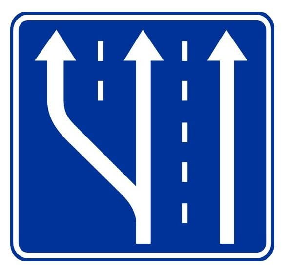 Znak D-13a Początek pasa ruchu Oznacza początek pasa ruchu po stronie wskazanej na znaku. Umieszczona pod znakiem tabliczka T-1a wskazuje odległość do początku lub końca pasa ruchu.Oznacza początek pasa ruchu po stronie wskazanej na znaku. Umieszczona pod znakiem tabliczka T-1a wskazuje odległość do początku lub końca pasa ruchu. |
