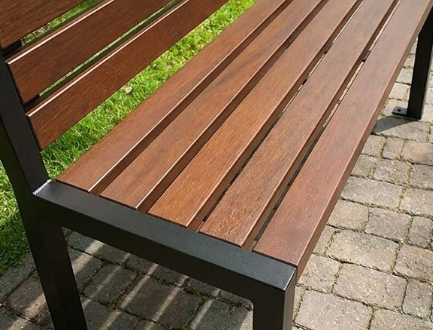 Siedzisko oraz oparcie wykonane są z drewna iglastego, które jest szlifowane i frezowane, a następnie trzykrotnie malowane lazurą ochronną. Zapewnia to estetyczny wygląd oraz wysoką odporność na działanie niekorzystnych warunków atmosferycznych.