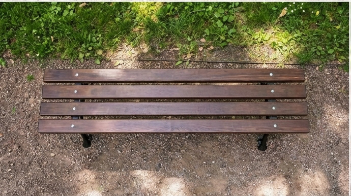 - Materiały: 2x odlew żeliwny malowany antykorozyjnie; drewno iglaste malowane podkładem i lazurą do drewna
