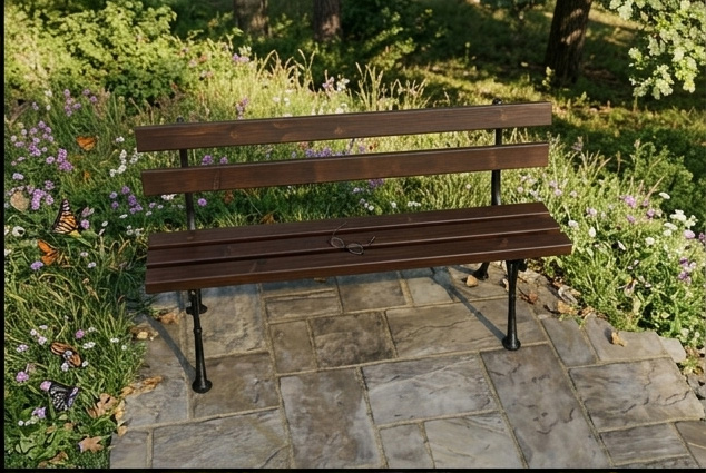 - Materiały: 2x odlew żeliwny malowany antykorozyjnie; drewno iglaste malowane lazurą (3 warstwy)