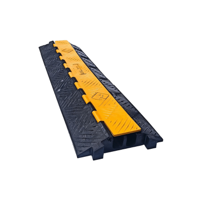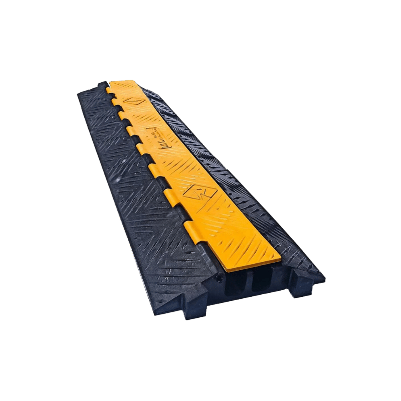 Próg kablowy drogowy dwukanałowy jest wyposażony w żółtą pokrywę, pod którą znajdują się dwa kanały przeznaczone do przewodów. Ten modułowy system umożliwia łatwe łączenie poszczególnych segmentów na zasadzie puzzli, co sprawia, że jest idealny do tymczasowego zastosowania w miejscach, gdzie stały ruch pojazdów jest ograniczony.