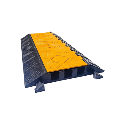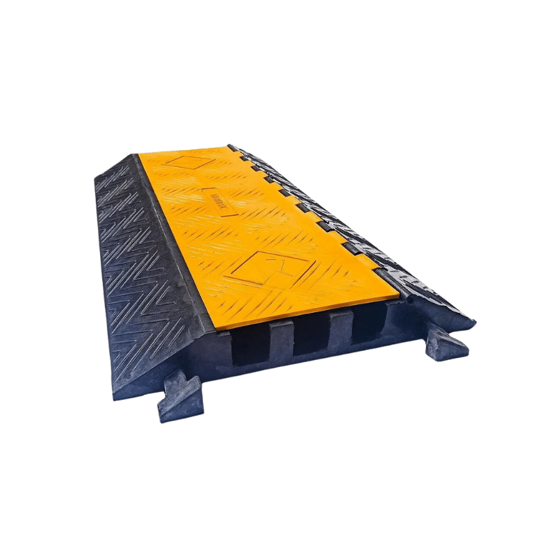 Próg kablowy drogowy trzykanałowy jest wyposażony w żółtą pokrywę, pod którą znajdują się trzy kanały przeznaczone do przewodów. Dzięki modułowej konstrukcji, poszczególne segmenty mogą być łatwo łączone ze sobą w stylu puzzli, co czyni je idealnym rozwiązaniem do tymczasowego zastosowania w obszarach tymczasowo wyłączonych z ruchu.
