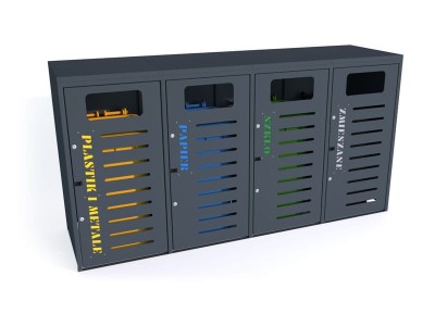 Nowoczesna i trwała zabudowa koszy do segregacji odpadów 4x120L, wykonana z blachy 1,5 mm. Składa się z czterech komór i jest przystosowana do pojemników o maksymalnej pojemności 120 litrów. Solidna konstrukcja zapewnia odporność na czynniki atmosferyczne i wandalizm. Istnieje możliwość doboru koloru wg palety RAL oraz rozbudowy zabudowy o kolejne komory.
