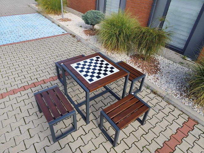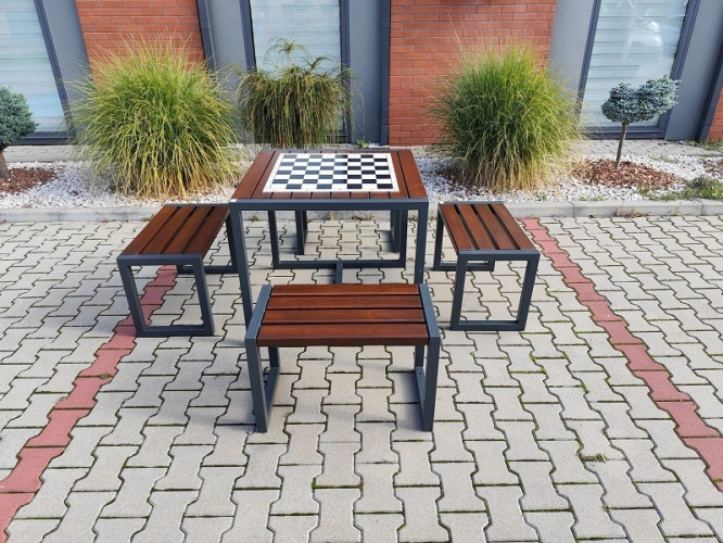 Zestaw szachowy to funkcjonalne rozwiązanie do przestrzeni publicznych, składające się ze stołu z planszą oraz czterech siedzisk bez oparcia. Idealnie sprawdzi się w parkach, na skwerach, przy szkołach, sanatoriach oraz w przestrzeniach rekreacyjnych.